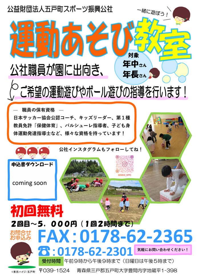 2026.04.14 イベント 運動あそび教室指導者派遣事業 外遊びや多人数での遊びが少なくなった現代の子どもたちに、スポーツや運動を通じて身体を動かすことの楽しさや喜びを体感してもらうために、公社職員が園に出向き、ご希望の指導を行います! ①運動あそび教室 申込書(PDF) ②運動あそび教室 日程希望表(PDF) イベント カテゴリ イベント